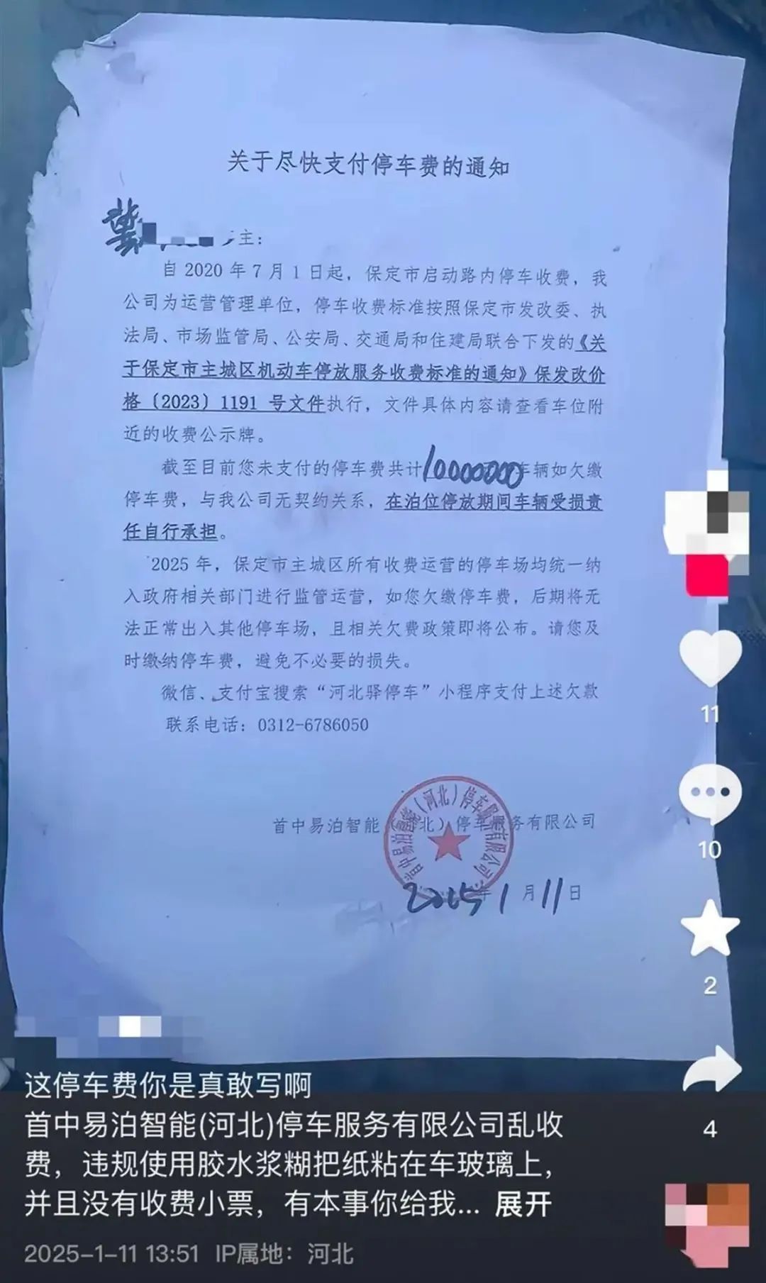 1月11日,河北一名网友发帖称,保定一家公司发通知催缴停车费,称一名车主欠费1000万元。1月12日,首中易泊智能(河北)停车服务有限公司工作人员告诉记者,不可能有欠费1000万元的车主,他们会核实视频内容。